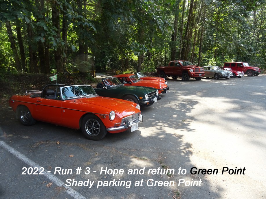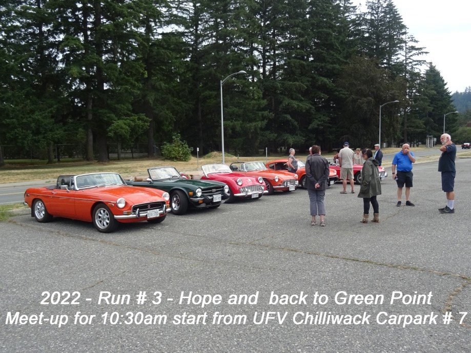 The 10:15 to 10:30am meet-up at Parking lot # 7 on the Chilliwack UFV campus saw six cars in the line up under grey skies. One advised a spot of engine trouble – seemed to be running rich and prone to cutting out, and if this continues, it’d be a return home to Yarrow and take the family car to come to Green Point for the picnic lunch…. In the end event, this was done.