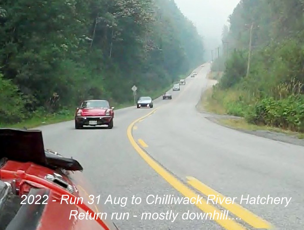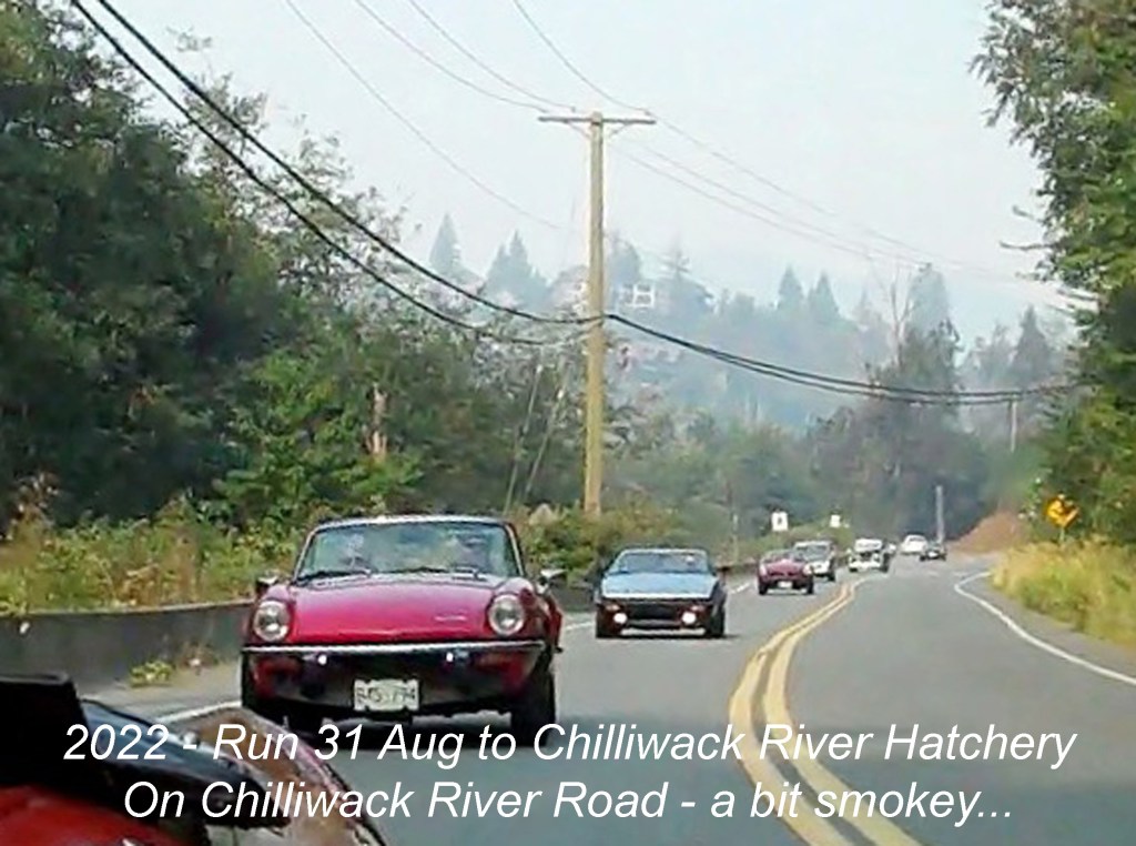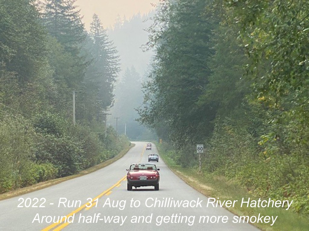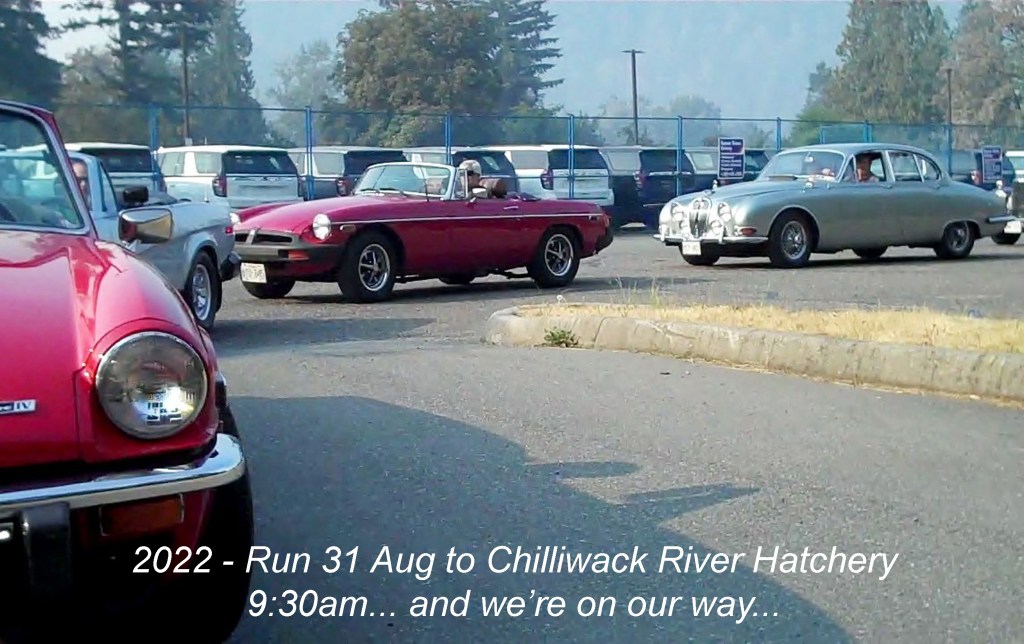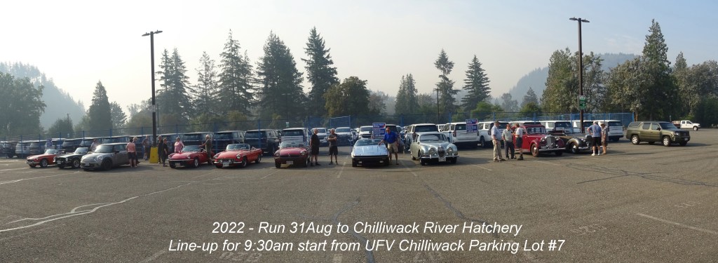 31 August being a Wednesday was a bonus as Wednesdays are our preferred day for Runs. The weather forecast was for a sun and cloud mix with up to 29deg C in the afternoon. The start from Parking Lot # 7 on the UFV Chilliwack campus was set for 9:30am, a bit earlier than usual so we could arrive around 10:00am, the time envisaged for the start of the second egg-take. The day dawned quite smokey due to forest fires south of the border, with visibility around 1,500m, but it got better as the day progressed. By 9:30am eleven cars had lined up – six 2-seater convertibles, three saloons, one drop-head coupé and one 4×4, and off we set…….
