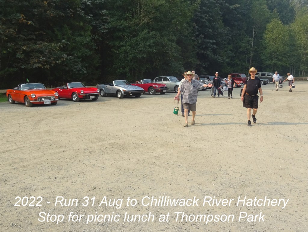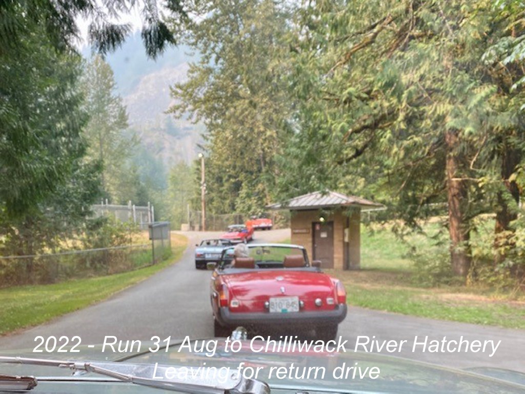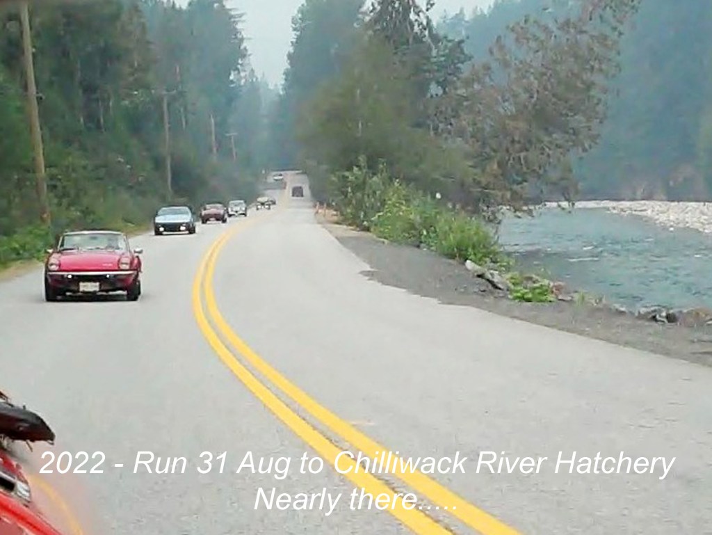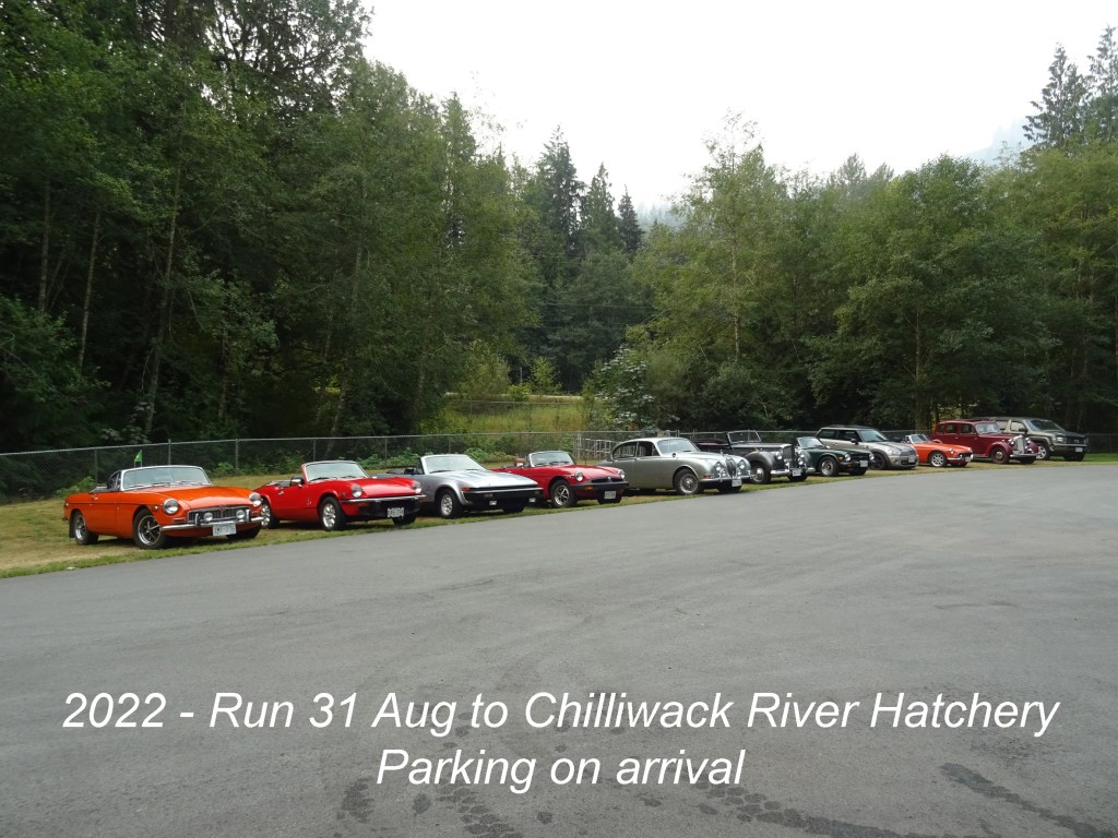 31 August being a Wednesday was a bonus as Wednesdays are our preferred day for Runs. The weather forecast was for a sun and cloud mix with up to 29deg C in the afternoon. The start from Parking Lot # 7 on the UFV Chilliwack campus was set for 9:30am, a bit earlier than usual so we could arrive around 10:00am, the time envisaged for the start of the second egg-take. The day dawned quite smokey due to forest fires south of the border, with visibility around 1,500m, but it got better as the day progressed. By 9:30am eleven cars had lined up – six 2-seater convertibles, three saloons, one drop-head coupé and one 4×4, and off we set…….