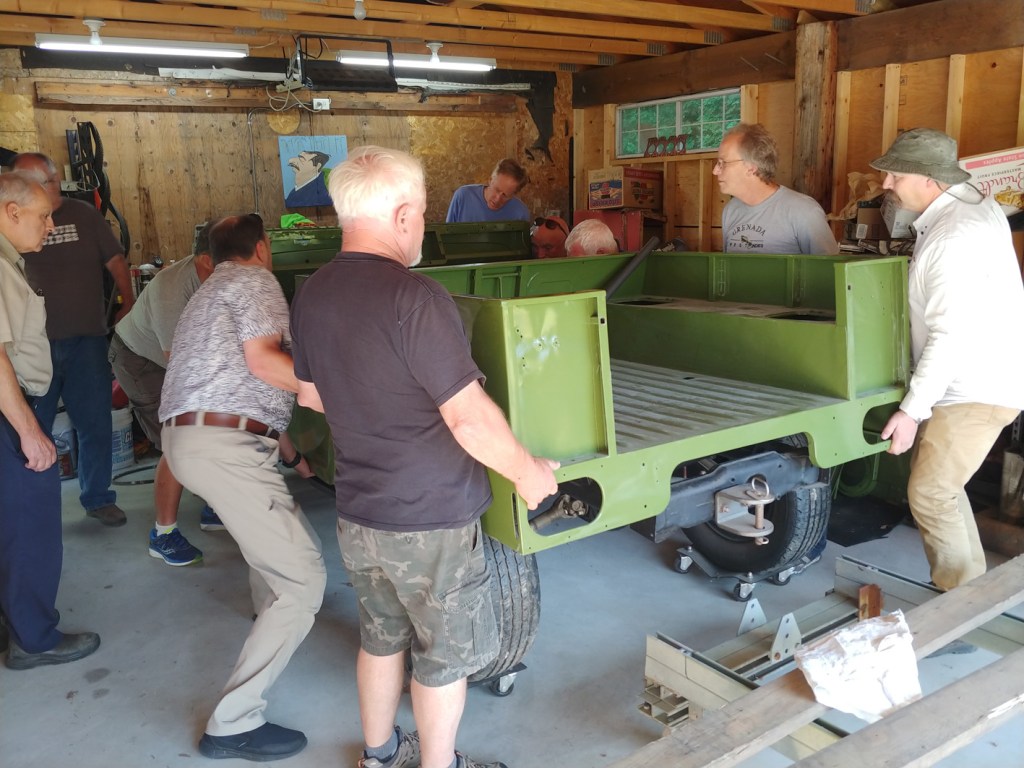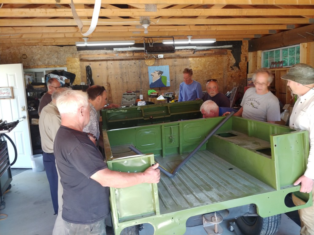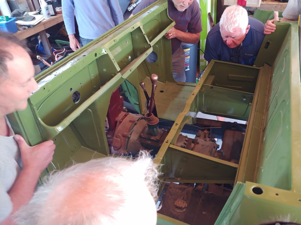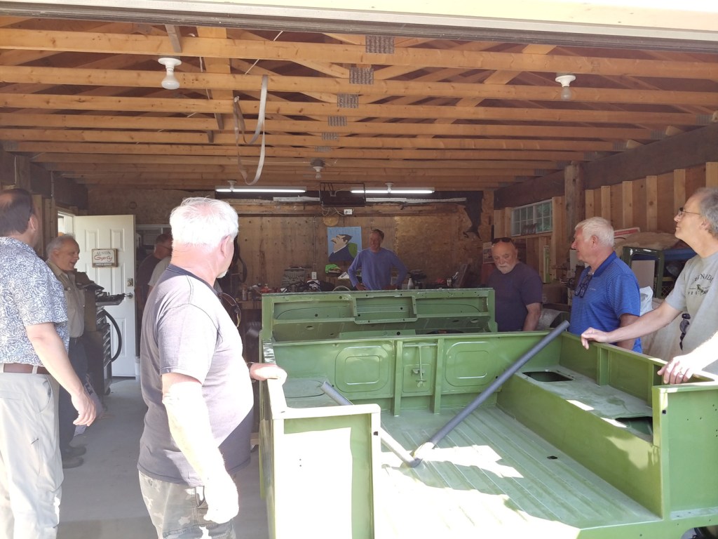 The Friday morning crew met at Bill McClure’s place in Yarrow with the purpose to assemble enough muscle to lift the refurbished body of Bill’s Austin Gypsy back onto the chassis. The lift went okay, but on lowering into place, the bottom of the vertical gussen panel hung up on the fuel tank bracket, which had been fabricated as a replacement to the rusted out original…. so had it been made up wrong? An inspection of another Gypsy out in the yard showed that the bracket appeared to be identical – and the lower part of the panel had been moulded to pass over the bracket — so, the solution would seem to be to do a similar profiling…. It appears that Bill will have some more work to make all comfortably fit….