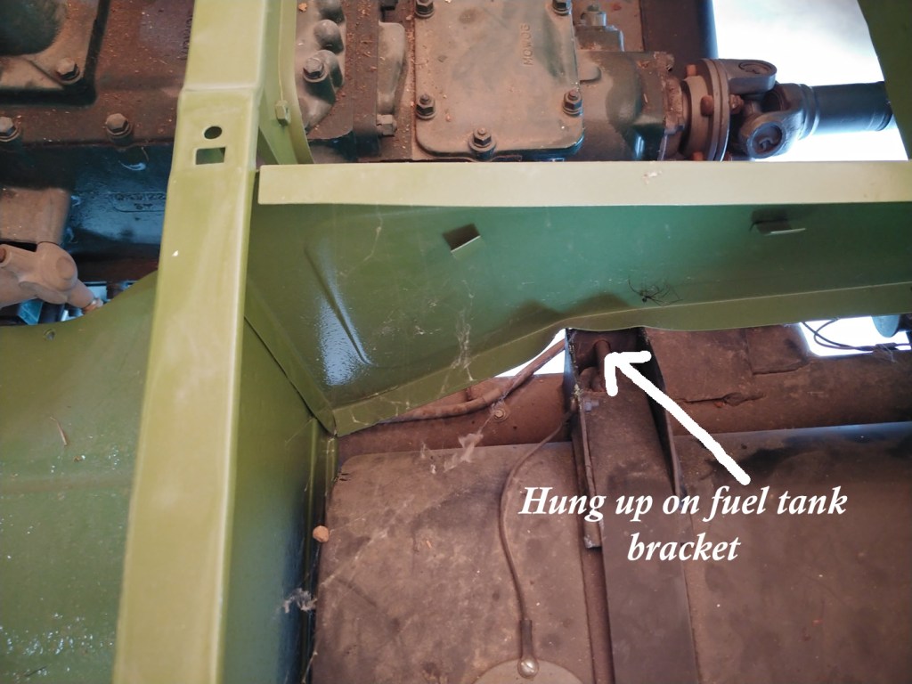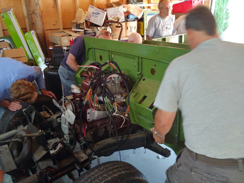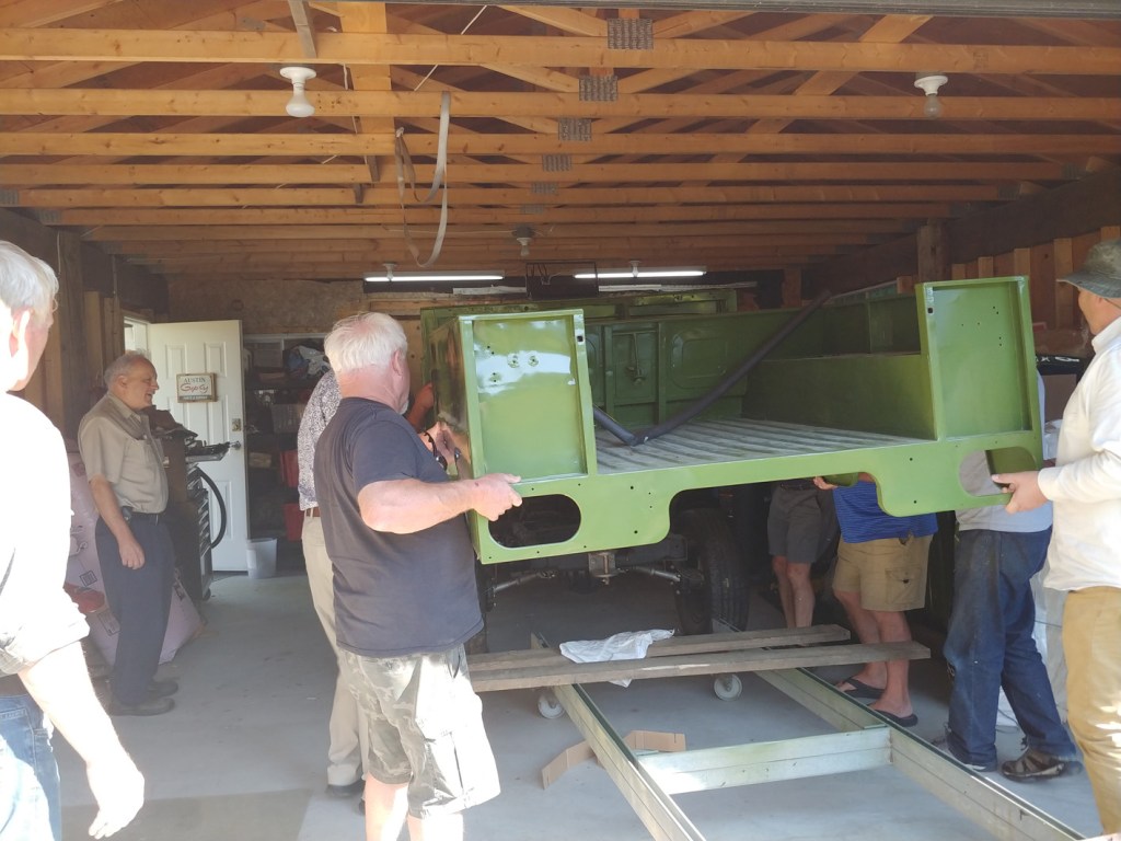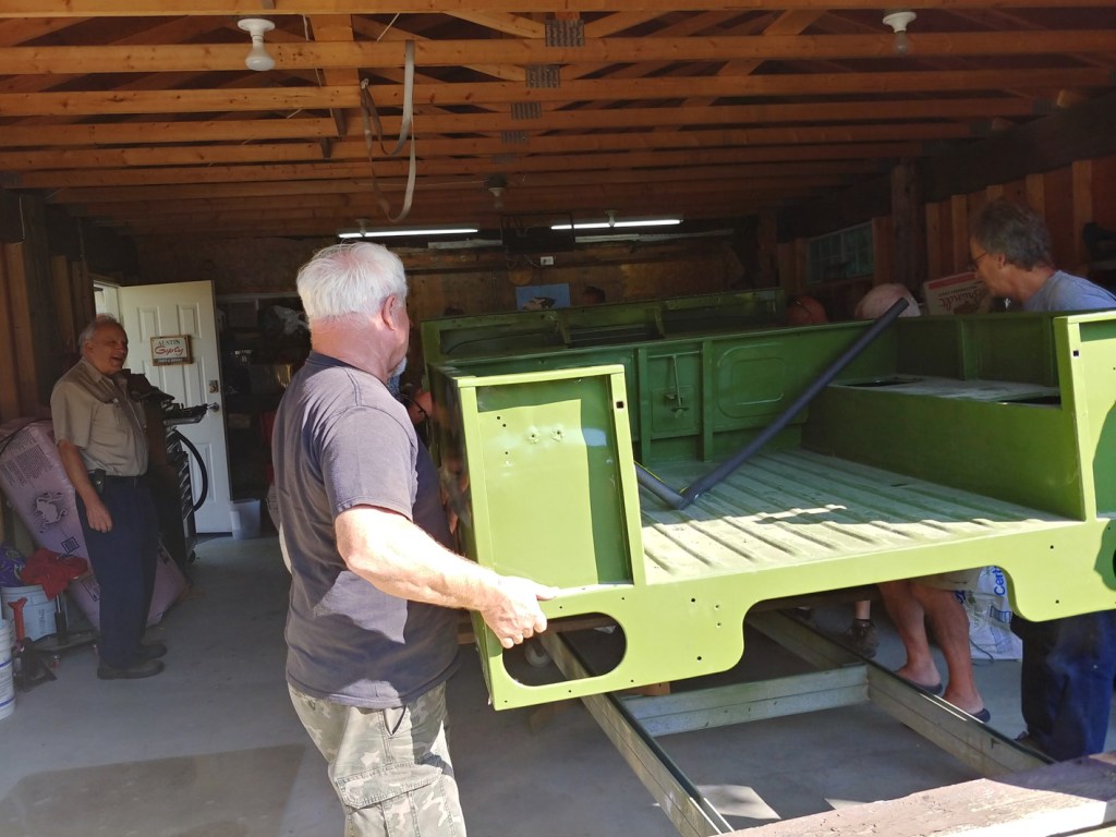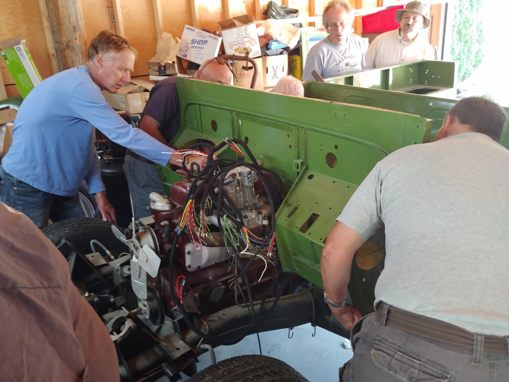 The Friday morning crew met at Bill McClure’s place in Yarrow with the purpose to assemble enough muscle to lift the refurbished body of Bill’s Austin Gypsy back onto the chassis. The lift went okay, but on lowering into place, the bottom of the vertical gussen panel hung up on the fuel tank bracket, which had been fabricated as a replacement to the rusted out original…. so had it been made up wrong? An inspection of another Gypsy out in the yard showed that the bracket appeared to be identical – and the lower part of the panel had been moulded to pass over the bracket — so, the solution would seem to be to do a similar profiling…. It appears that Bill will have some more work to make all comfortably fit….