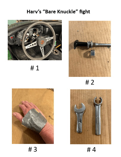 The new cable had the same narrow nut as the old one and I wanted to use a normal-sized one – see photo # 2. So I fed the new cable in through the dash to have the knob up against the dash and let the cable go down in the inside to the floor. I then fed on the normal-sized nut and worked it up the cable and gave it a couple of turns to start it on the thread and taped it to avoid it possibly unscrewing. I then attached the string to the outer end of the cable and, pulling on the string and carefully feeding the end up and through the firewall, it came through quite easily only needing a jerk now and again. With the new cable pulled through, and the knob housing up against the dash, now came Round 2 of the “Bare Knuckle” fight. This involved getting the new nut to screw onto the housing. With the tape removed, and the nut being normal-sized, it was fairly easy to locate and twist with finger and thumb, but non-the-less, they had to be got up there and, with the actual space available and previous experience, the knuckles were protected with duct tape… Once the nut had been turned right up to be finger-tight involving numerous knuckle-contacts but now tape-protected, the final tightening could be done with the cut-down normal spanner – see photo # 4, which could be turned about a third of a turn… and then the fist + spanner withdrawn… Oufff …. and after connecting the inner cable to the carburettor the job was completed! ….. and, thank goodness, not one necessary to do again for quite some time. Duct tape removal was simple, if rather painful as it also involved the removal of most of the hairs on the back of the hand…. So, there you have it….. and I hope this article will help prospective cable replacers a bit more than what can be found on YouTube and handbooks which seems to focus on removal of the old cable with little on installing the new one which is not really “ To install new cable, reverse this procedure “….