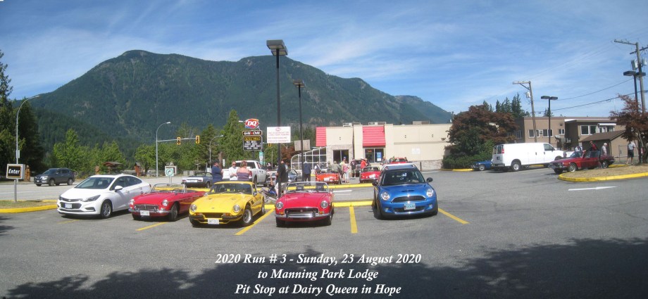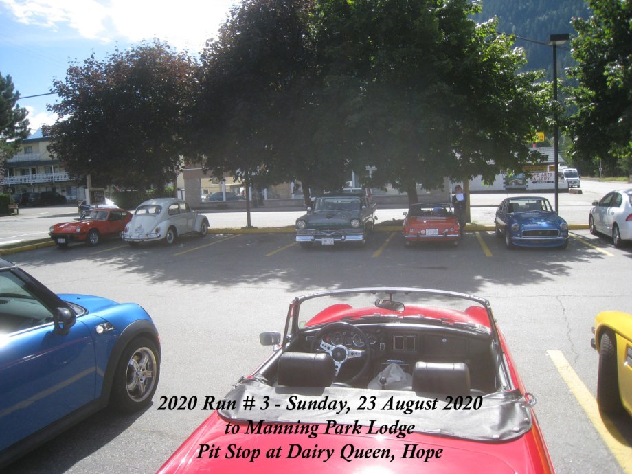 Despite a rainy day on the Friday and an indifferent Saturday, the Run day on Sunday was mostly clear and sunny. By the stated 10:15am meet-up time at the Mt. Cheam Golf Course the parking area was already quite full and there were not many vacant slots. As more of the Run cars arrived, we were resorting to double-parking when a groundsman came by and advised that we should please leave. By then there were 18 of us and it was just on 10:30am so we lined up and set off east along Luckakuck Way. There were 12 FVBCC cars, 4 from LAMB and 2 who came along as friends of members. Everyone found their way ok to Prairie Central then north on Gibson to join Yale out through Rosedale to Route 9 to skirt Agassiz and join Route 7 for Hope. We reached the Hope Dairy Queen for the scheduled Pit Stop around 11:20am. John Walkden in his 1957 Ford Meteor arrived a few minutes later, having stopped for gas. By 11:40am we were ready to leave for Manning Park. We took the Old Hope-Princeton Highway to join Route 3 with its eastward scenic route and climb to the Allison Pass at 1,342m, then the final 5 miles on down to Manning Park Lodge at 1,194m. Just a few miles short, the green MGB invited as friend, had to pull over with a clutch problem. Several cars stopped to offer assistance, but were waved on. The car eventually arrived at the Lodge and was able to set off ok for the return journey. When we arrived at around 12:30pm there were spaces available, but here and there, so a grand line-up was not possible and there were 4 to 5 person socially-distanced queues for the washrooms. As to picnic benches, there were several available and the rest of the Drive set up in socially-distanced groups, mostly in the shade, though with the temperature at around 18 deg C and the breeze, some found it quite pleasant to be out in the sun. By 1:45pm people began to pack up and leave and the last cars left at 2:15pm. The return route from Hope was driver’s choice – join the speeding week-end return traffic on H/w 1, or take the more sedate Route 7 to Route 9 and then through Rosedale. Some who took H/w 1 got into a crawl just after Annis road and this lasted to Chilliwack where they could branch off to go home, but the crawl was seen to be stretching further for the LAMB cars. The odometer reading for a Chilliwack ending was 161.4 miles run.