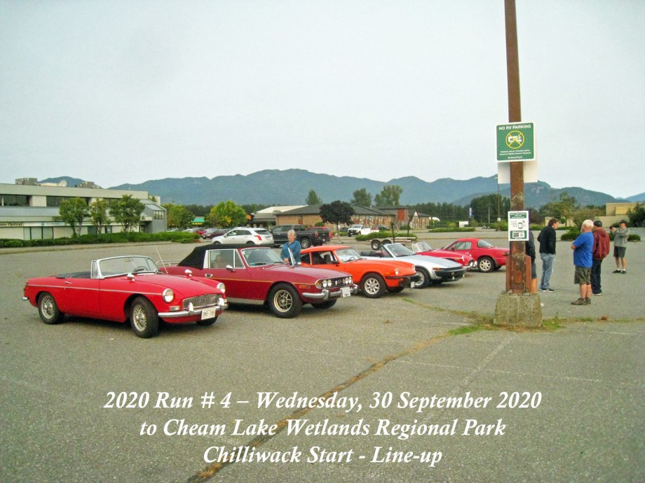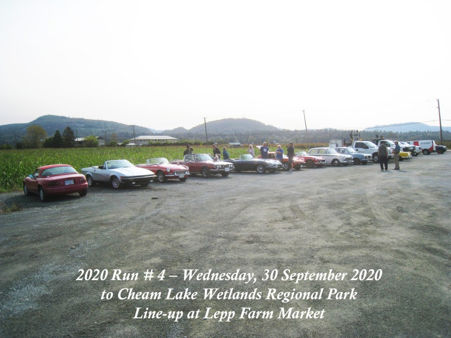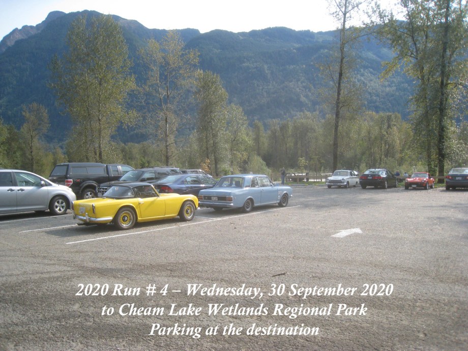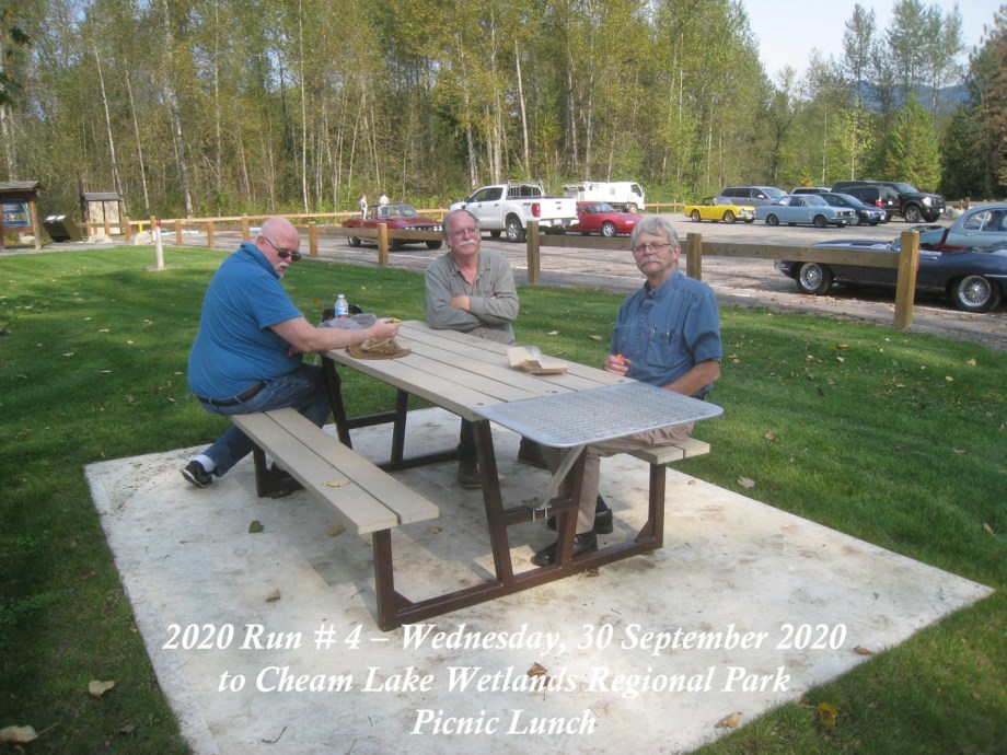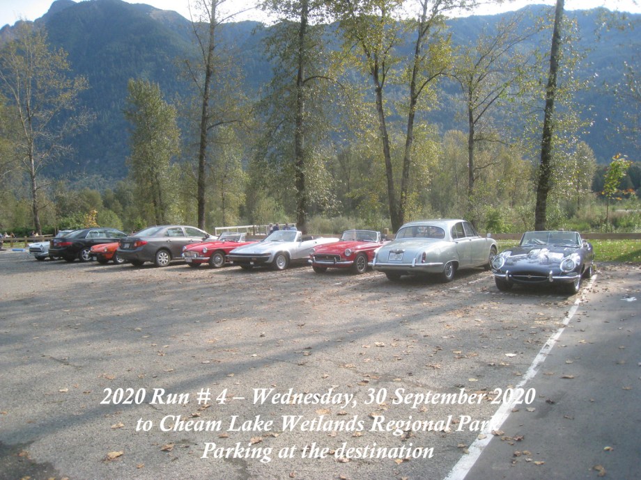 The Run was scheduled to have been on Sunday, 27 September, but the weather forecast was indicating overcast and rain with sunny and dry a few days later, so it was moved to Wednesday, 30 September. That day started out with signs of a smoke haze which, thankfully, seemed to lighten as the day progressed. The Chilliwack start was from the new location in the Cottonwood Mall parking and by 10:30am there were six cars and a start wasmade. As we made our way round the bend off N. 3 road onto the N. Parallel, a yellow Triumph TR4 was noticed parked on the verge of the main highway. Was he one of ours? He took off and came along parallel with our group and we could see that it was Jay Schermererhorn from Yarrow. He carried on along the highway and up through Abbotsford to the Lepp Farm Market meeting point. By 11:30am there were ten cars there, with pride of place going to Doug and Geraldine Charles with their 1961 Jaguar E-type. We set off for the main leg of the Run up Route 11 to Mission, then east on Route 7 to Agassiz and a short bit of Route 9 southwards over the Agassiz bridge. We turned onto Yale Road East to follow the signs to the destination at Cheam Lake Wetlands Regional Park, arriving by 12.40pm. There were no incidents and there were numerous glimpses of the Autumn colours starting to show. At the Regional Park there was plenty of parking but cars were scattered, so we could not get a line-up alongside Harv and Shirley McCullough who’d come with their Jaguar S-type to join for the picnic lunch. We all managed to find seating – socially distanced – at the various trestle tables to enjoy our picnic lunches and the lakeside scenery backed by Mt. Cheam and the Dogshead – already a trace of snow here and there. Packing up and leaving was under way by 2:00pm, with folks making their own way back home. All agreed it had been a nice run and a fitting end to the 2020 Runs.
