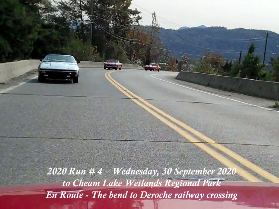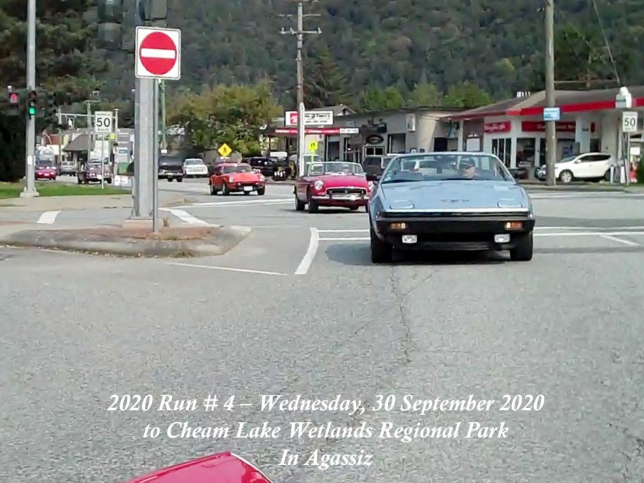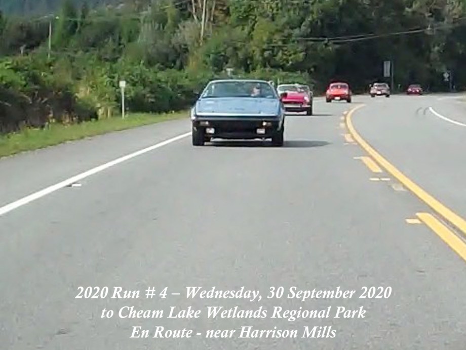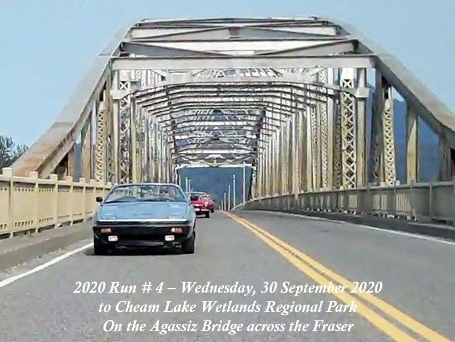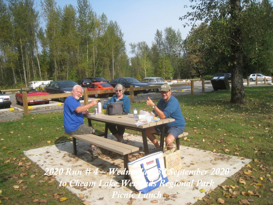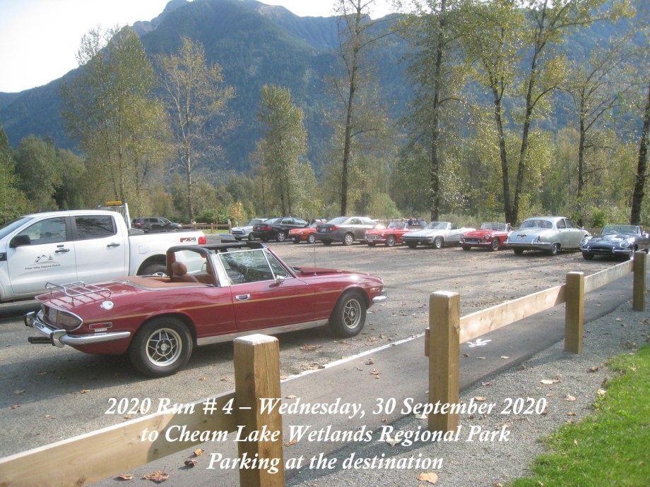 The Run was scheduled to have been on Sunday, 27 September, but the weather forecast was indicating overcast and rain with sunny and dry a few days later, so it was moved to Wednesday, 30 September. That day started out with signs of a smoke haze which, thankfully, seemed to lighten as the day progressed. The Chilliwack start was from the new location in the Cottonwood Mall parking and by 10:30am there were six cars and a start wasmade. As we made our way round the bend off N. 3 road onto the N. Parallel, a yellow Triumph TR4 was noticed parked on the verge of the main highway. Was he one of ours? He took off and came along parallel with our group and we could see that it was Jay Schermererhorn from Yarrow. He carried on along the highway and up through Abbotsford to the Lepp Farm Market meeting point. By 11:30am there were ten cars there, with pride of place going to Doug and Geraldine Charles with their 1961 Jaguar E-type. We set off for the main leg of the Run up Route 11 to Mission, then east on Route 7 to Agassiz and a short bit of Route 9 southwards over the Agassiz bridge. We turned onto Yale Road East to follow the signs to the destination at Cheam Lake Wetlands Regional Park, arriving by 12.40pm. There were no incidents and there were numerous glimpses of the Autumn colours starting to show. At the Regional Park there was plenty of parking but cars were scattered, so we could not get a line-up alongside Harv and Shirley McCullough who’d come with their Jaguar S-type to join for the picnic lunch. We all managed to find seating – socially distanced – at the various trestle tables to enjoy our picnic lunches and the lakeside scenery backed by Mt. Cheam and the Dogshead – already a trace of snow here and there. Packing up and leaving was under way by 2:00pm, with folks making their own way back home. All agreed it had been a nice run and a fitting end to the 2020 Runs.