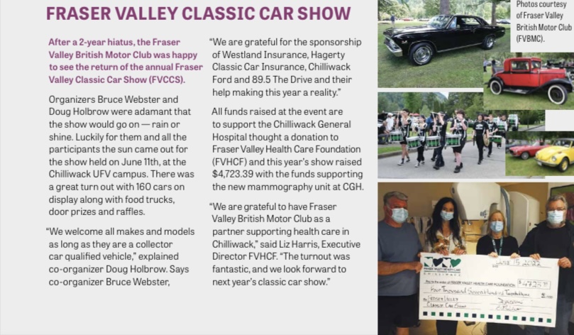 The Fraser Valley Classic Car Show was held on Saturday, June 11th, 2022. The weather did not deter attendees and the show proved to be a successful event. Donations at the show went to the Fraser Health Care Foundation to aid in the purchase of equipment for the Chilliwack Hospital.