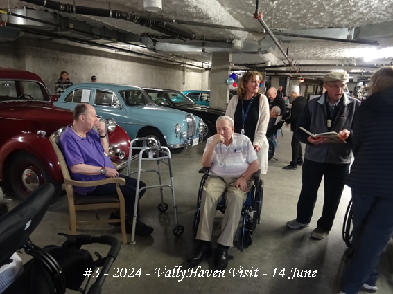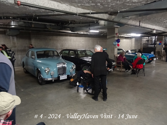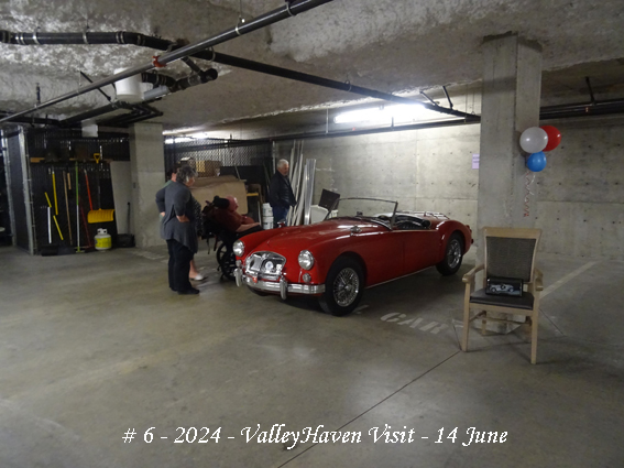 Given the uncertain weather, the Home advised that space could be made available in the underground staff parking area. This was just as well as, by the 11:00am arrival time, it was overcast with a few spots of rain. Arrivals were directed down the ramp and lined up in the stalls marked off for our possible use. In all eight cars came, four being saloons and four being soft-tops, all top-down.